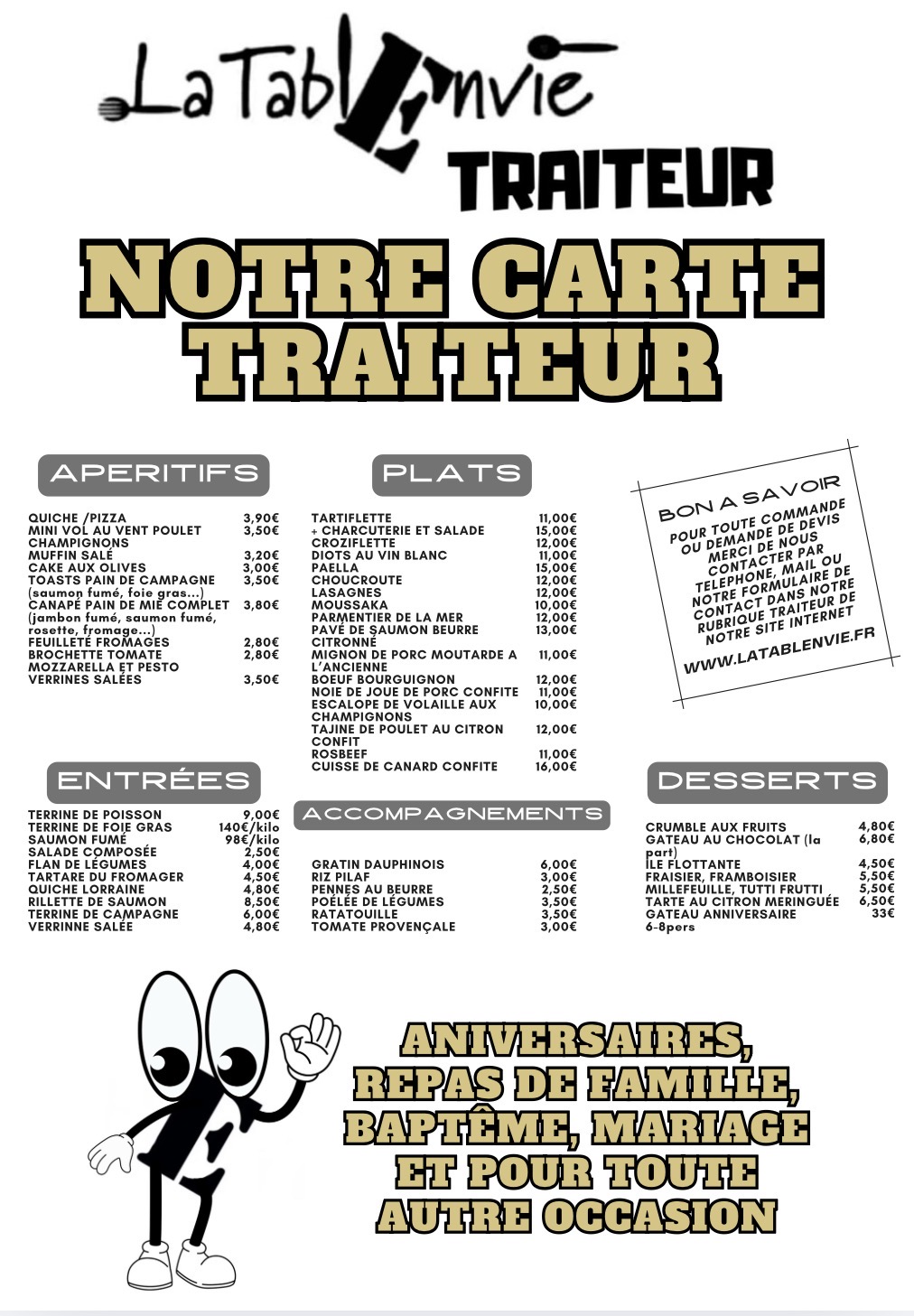 Nous vous proposons notre carte traiteur pour vos repas de tous les jours, d’anniversaire, familiaux, baptême, repas d’entreprise….